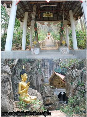 (บน) ซุ้มประตูและบันไดขึ้นไปถ้ำดอกคำ (ล่าง) ถ้ำดอกคำปัจจุบันอยู่ในบริเวณ วัดถ้ำดอกคำ บ้านน้ำแพร่ อำเภอพร้าว จังหวัดเชียงใหม่ (รูปโดย ผู้เขียน, 2556)