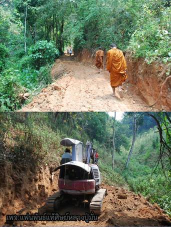 ขณะผู้เขียนเดินทางไปถึงในเช้าวันที่ 15 เมษายน พ.ศ. 2556 กำลังมีการตัดถนน และถึงบริเวณห้วยตุ๊เจ้าพอดี (รูปโดยผู้เขียน, 2556)