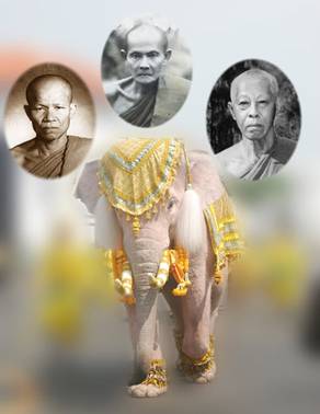 คือขณะนั้นปรากฏว่ามีช้างเชือกหนึ่งใหญ่มากเดินเข้ามาหาท่าน แล้วทรุดตัวหมอบลงแสดงเป็นอาการจะให้ท่านขึ้นบนหลัง ท่านก็ปีนขึ้นบนหลังช้างเชือกนั้นทันที พอท่านขึ้นนั่งบนคอช้างเรียบร้อยแล้ว ขณะนั้นปรากฏว่ามีพระวัยหนุ่มอีกสององค์ ขี่ช้างองค์ละเชือกเดินตามมาข้างหลังท่าน ช้างทั้งสองเชือกนั้นใหญ่พอ ๆ กัน แต่เล็กกว่าช้างตัวที่ท่านกำลังขี่อยู่เล็กน้อย ช้างทั้งสามเชือกนั้นมีความองอาจสง่าผ่าเผยและสวยงามมากพอ ๆ กัน คล้ายกับเป็นช้างทรงของกษัตริย์ มีความฉลาดรอบรู้ความประสงค์และอุบายต่าง ๆ ที่เจ้าของบอกแนะดีเช่นเดียวกับมนุษย์ พอช้างสองเชือกของพระหนุ่มเดินมาถึง ท่านก็พาออกเดินทางมุ่งหน้าไปทางภูเขาที่มองเห็นขวางหน้าอยู่ไม่ห่างจากที่นั้นนัก ประมาณ ๑ กิโลเมตร ช้างท่านเป็นผู้พาเดินหน้าไปอย่างสง่าผ่าเผย