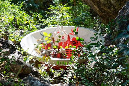 ปูนปั้นจำลอง ขุมนรกกระทะทองแดง บริเวณทางขึ้นสู่ถ้ำไผ่ขวาง วัดทุ่งสิงห์โต อ.เมือง จ.ลพบุรี (รูปจาก โครงการท่องเที่ยวโดยชุมชนตามรอยองค์หลวงปู่มั่น ภูริทตฺโต)