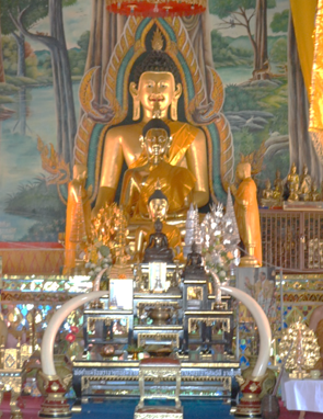 พระพุทธรูปพระเจ้าทองทิพย์ (พระประธานองค์กลาง) พระพุทธรูปเก่าแก่ ซึ่งมีตำนานมาจากล้านช้าง คาดว่าน่าจะเกี่ยวเนื่องกับบันทึกประวัติพระอาจารย์มหาทองสุก ที่เรียกสถานที่นี้ว่า บ้านแม่ทองทิพย์ (รูปโดย Admin)