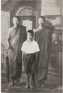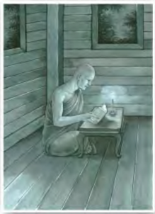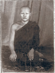 หลวงตามหาบัว ญาณสมฺปนฺโน เมื่อครั้งพรรษาต้นๆ และรูปภาพจำลองขณะกำลังศึกษาปริยัติธรรม (รูปจาก ญาณสัมปันนธัมมานุสรณ์ และหยดน้ำบนใบบัว) |