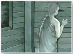 รูปภาพจำลองเหตุการณ์ หลวงตามหาบัว ญาณสมฺปนฺโน ขณะท่านแอบดูองค์หลวงปู่มั่น บิณฑบาตร เป็นการได้เห็นองค์หลวงปู่มั่นครั้งแรกของท่าน ในช่วงประมาณเดือน พฤษภาคม พ.ศ.2483 (รูปจาก หยดน้ำบนใบบัว)